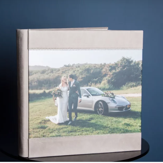 Een prachtig kunstlederen of linnen album met een foto van jullie op de voorkant.