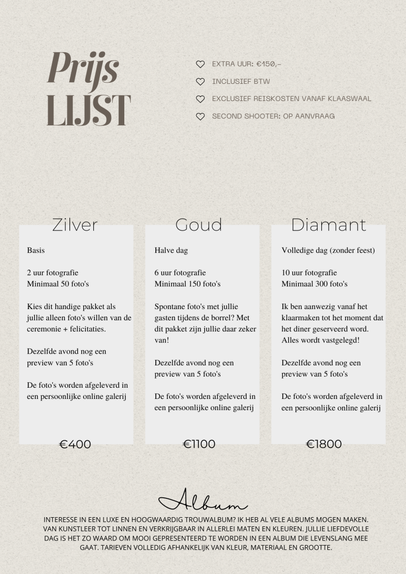 Van harte gefeliciteerd met jullie verloving! Ik kan mij voorstellen dat jullie nu druk bezig zijn met het plannen van jullie grote dag. Graag geef ik jullie op deze pagina wat korte info over mijn verschillende trouwpakketten. Meer van mijn werk zien en uitgebreid lezen hoe alles in zijn werk gaat? Download dan hier onder mijn gratis trouwbrochure.